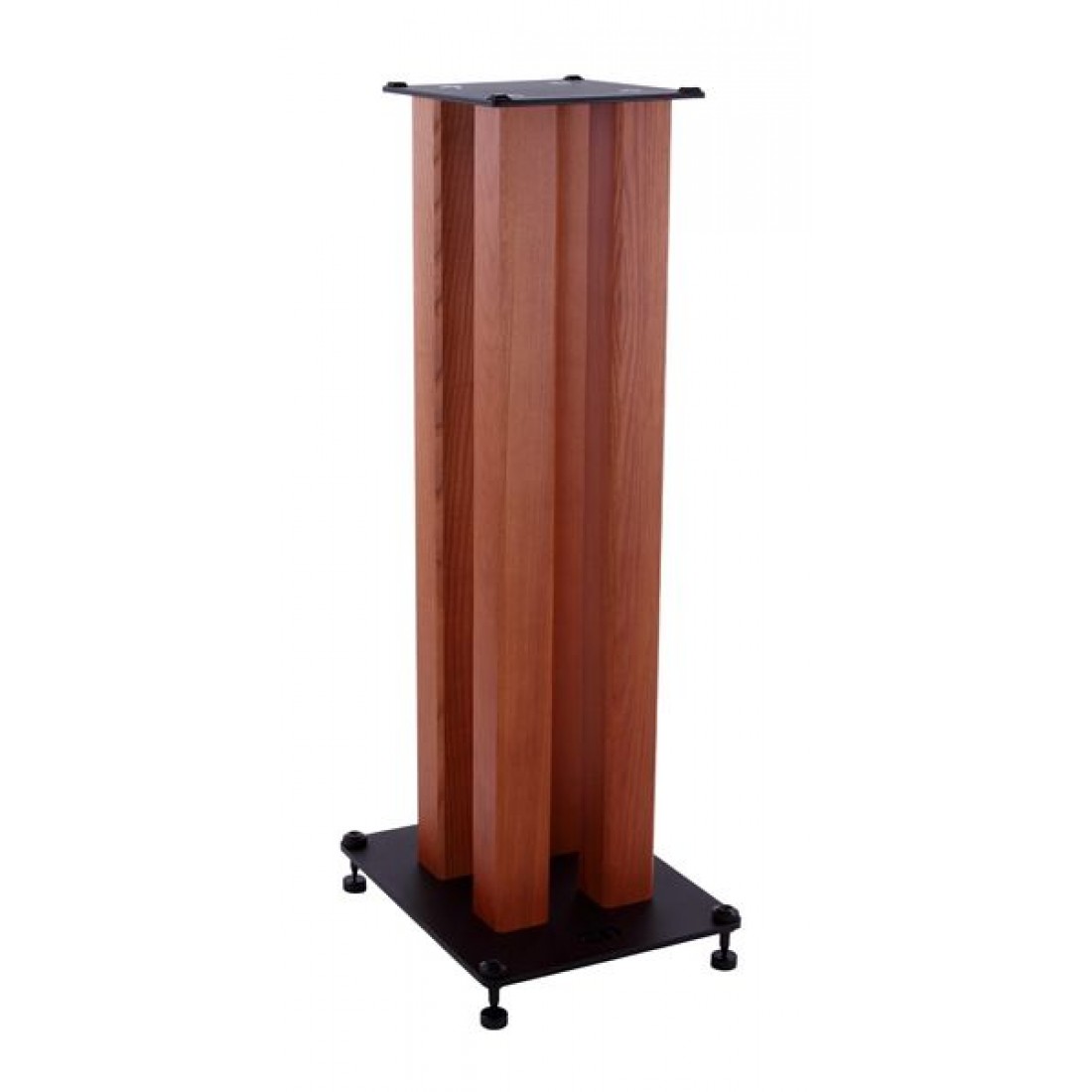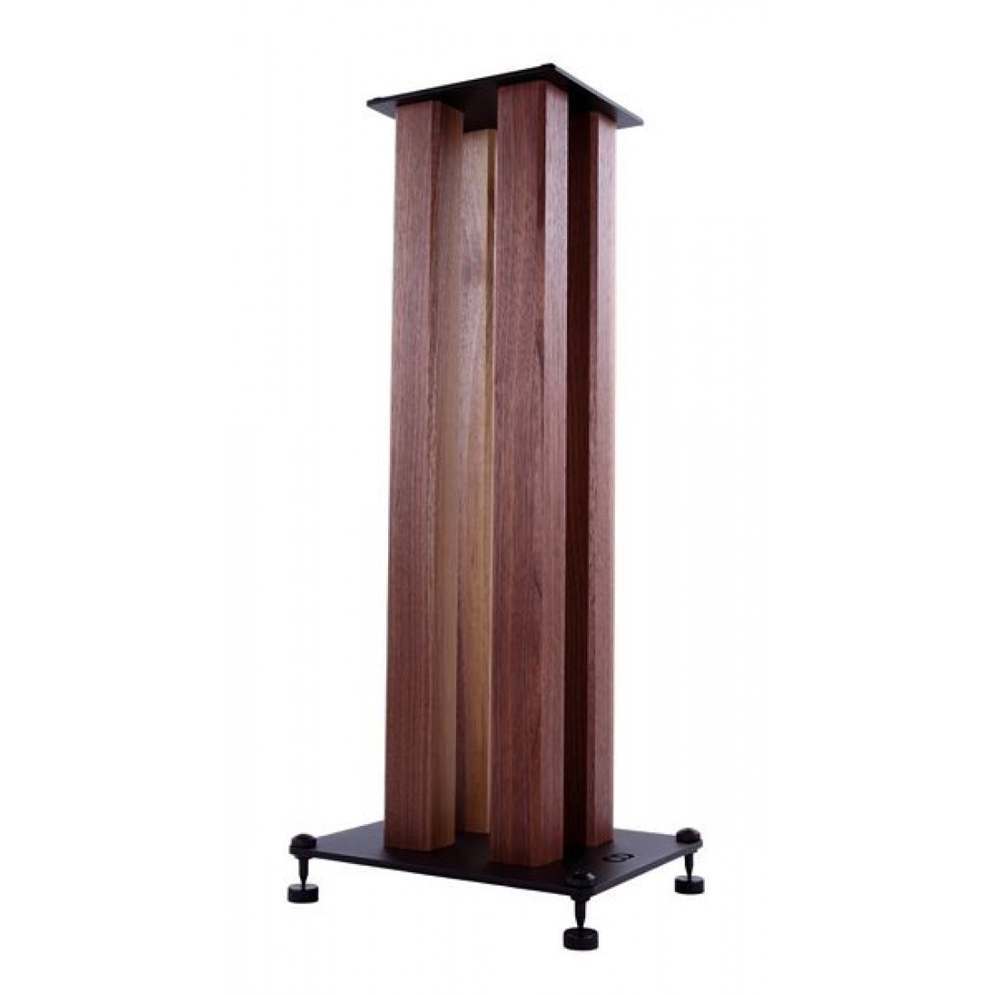 The solid hardwood version utilizes solid Ash, Oak or Walnut support columns which are harvested from sustainable, professionally managed forests. Available finishes include Black, White, Oak, Cherry, Mahogany, and Walnut. The natural properties of wood dampen resonance noise vibration preventing the transition through the design and influencing the stand and speaker's performance. The wooden version is lighter than the steel column version when mass loaded but still has effective vibration reduction without the expense of Inert Filler.