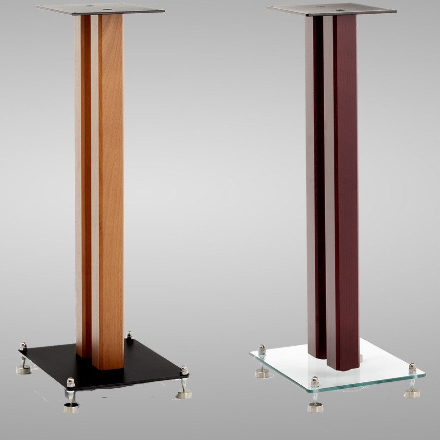 The solid hardwood-type columns offer a different type of acoustical resistance than steel and the natural properties of wood dampen resonance noise vibration preventing transmission through the design and influencing the stand and speaker's performance.