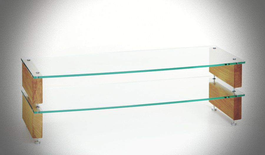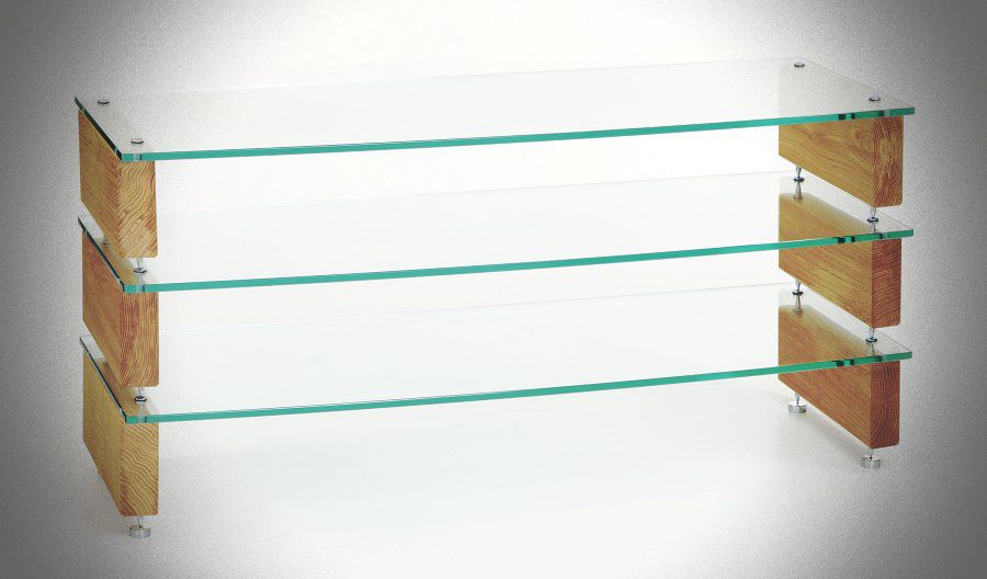 The Shelf-unit side pieces are made of solid real Oak, real Walnut or real Ash hardwoods in a range of finishes including Oak, Walnut, Cherry, Mahogany, Natural, Satin Black and Satin White, and some metallic finishes. The shelves are fully tempered Clear or Black 10mm thick glass with polished edges and a gentle front radius curve. The combination of hardwood and rigid glass offers excellent acoustical properties. Glass is durable and easy to maintain. Each shelf-unit can support 110lbs/ 50kg.
