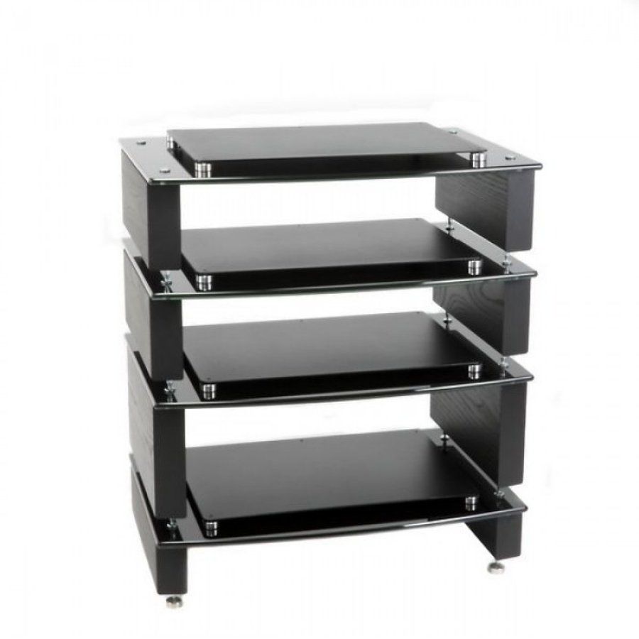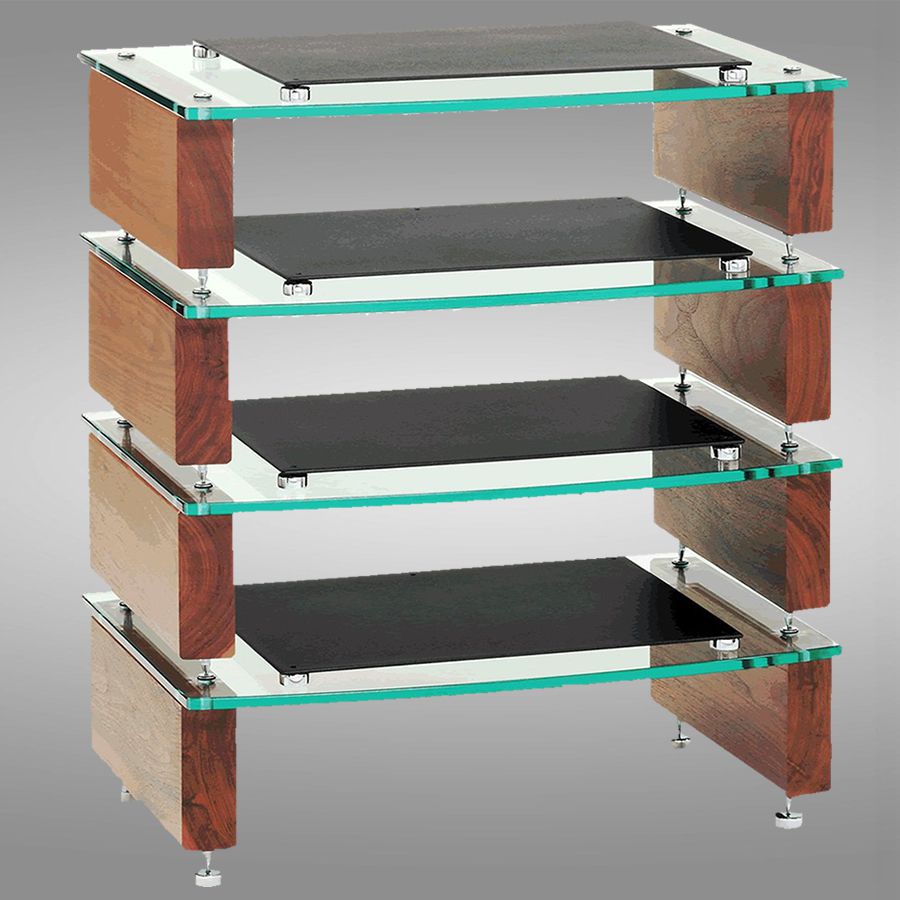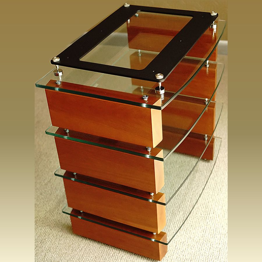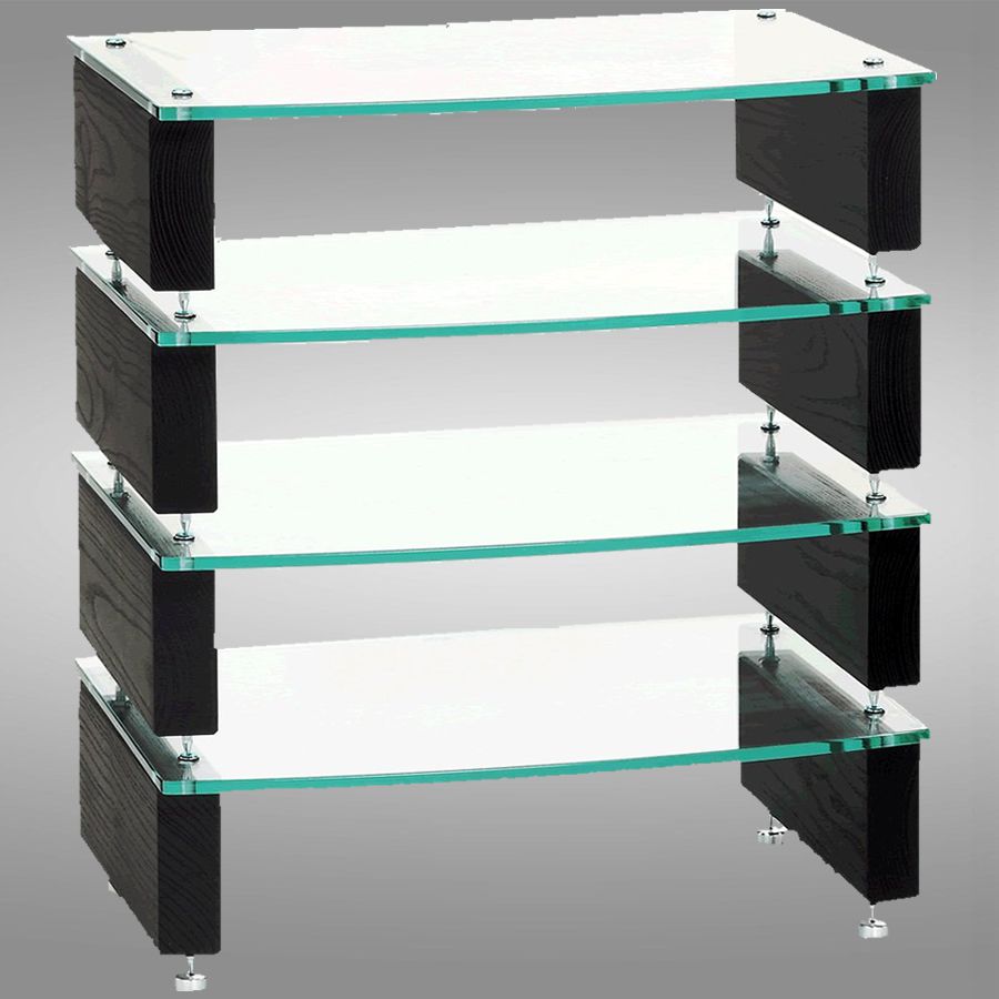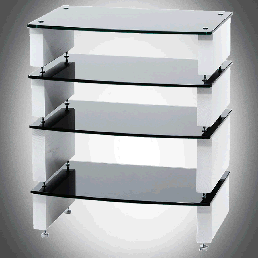The Shelf-unit side pieces are made of solid real Oak, real Walnut or real Ash hardwoods in a range of finishes including Oak, Walnut, Cherry, Satin Black and Satin White, and some metallic finishes. The shelves are fully tempered Clear or Black 10mm thick glass with polished edges and a gentle front radius curve. The combination of hardwood and rigid glass offers excellent acoustical properties. Glass is durable and easy to maintain. Each shelf-unit can support 110lbs/ 50kg.