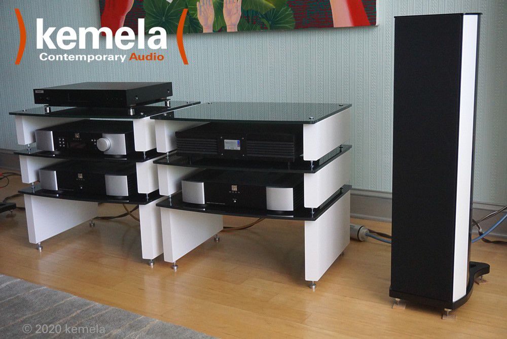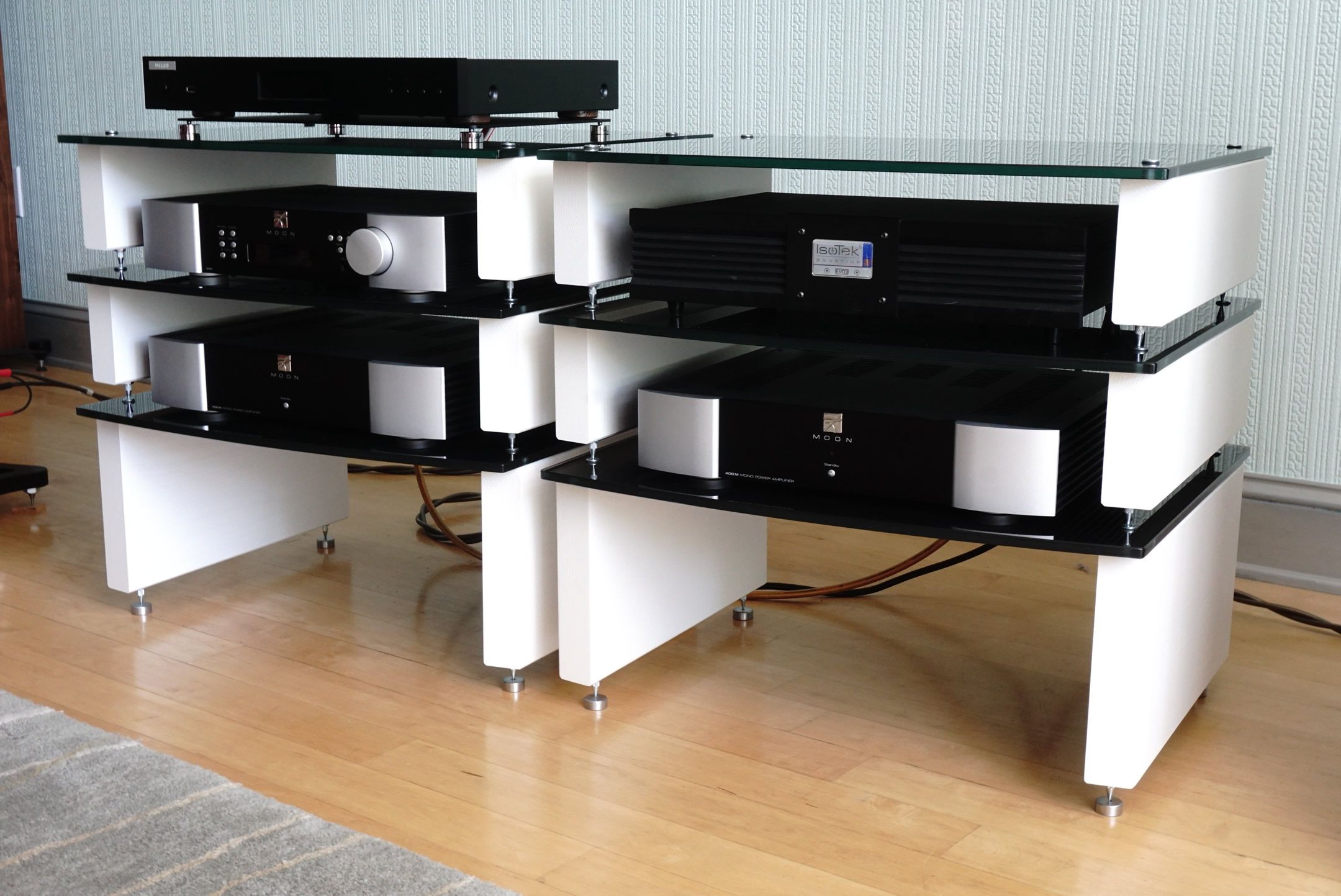The Shelf-unit side pieces are made of solid real Oak, real Walnut or real Ash hardwoods in a range of finishes including Walnut, Cherry, Satin Black and Satin White. The shelves are fully tempered Clear or Black glass with polished edges and a gentle front radius curve. The combination of Hardwood and rigid glass offers excellent acoustical properties. Glass is durable and easy to maintain. Each shelf-unit can support 110lbs/ 50kg.
