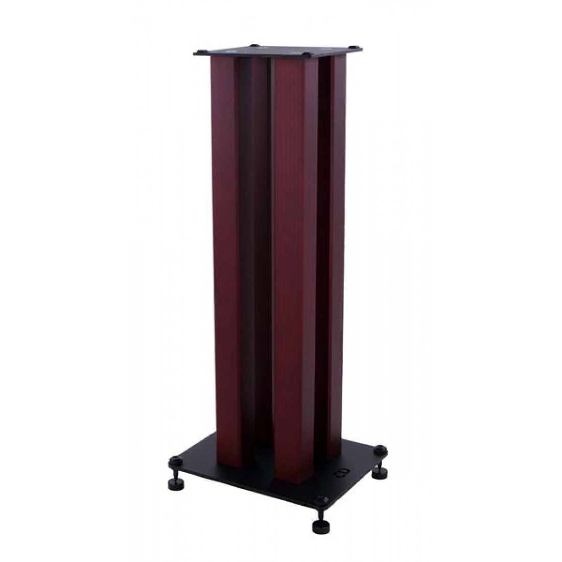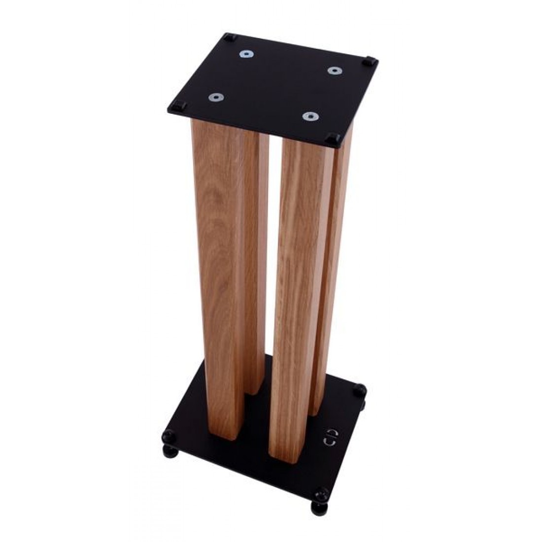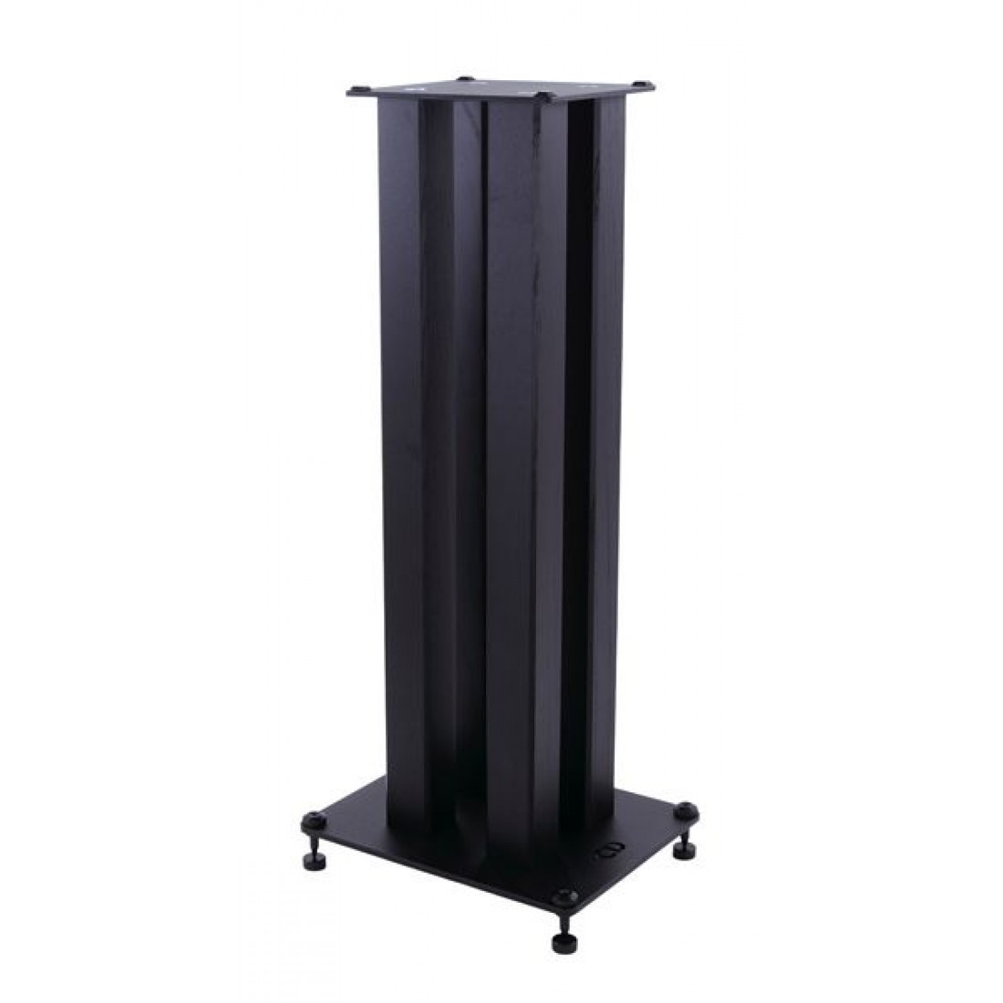 The solid hardwood version utilizes solid Ash, Oak or Walnut support columns which are harvested from sustainable, professionally managed forests. Available finishes include Black, White, Oak, Cherry, Mahogany, and Walnut. The natural properties of wood dampen resonance noise vibration preventing the transition through the design and influencing the stand and speaker's performance. The wooden version is lighter than the steel column version when mass loaded but still has effective vibration reduction without the expense of Inert Filler.